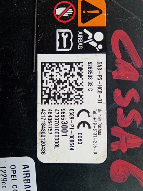 | Descrizione | AIRBAG SEDILE GUIDA OPEL CORSA E 2018 96853001 |