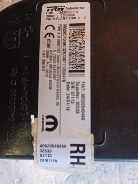 | Descrizione | AIRBAG SEDILE PASSEGGERO FIAT TIPO 2018 1.6 T.D. 52054046 |